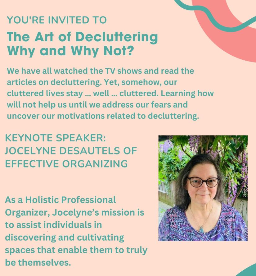 Our presenter is Jocelyne Desautels of Effective Organizing. As a Holistic Professional Organizer, Jocelyne’s mission is to assist individuals in discovering and cultivating spaces that enable them to truly be themselves.